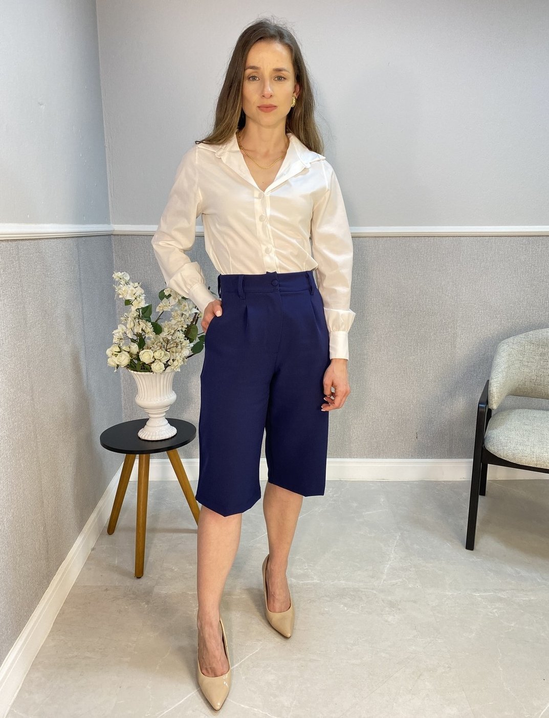 Conforto, elegância e sofisticação, nossa bermuda Cairo Office é uma versão alongada da nossa queridinha aqui no site. Vem para montar looks mais clássicos , sua modelagem é mais ampla nas pernas, possui pregas estratégicas na frente, bolso faca, cintura alta e bem marcada com cós que abraça a cintura, bolso falso nas costas e presilhas na cintura para agregar ao look com cintos da sua preferência. No comprimento representa o modelo mais alongado, até o  joelho, e bainha larga na barra. Ela leva esse nome por ser ideal para o dia a dia executivo , trabalho em escritório, para ambientes que exigem roupas mais sociais. Feita de alfaiataria de alta qualidade você pode usar ela também como uma opção linda para looks mais casuais.