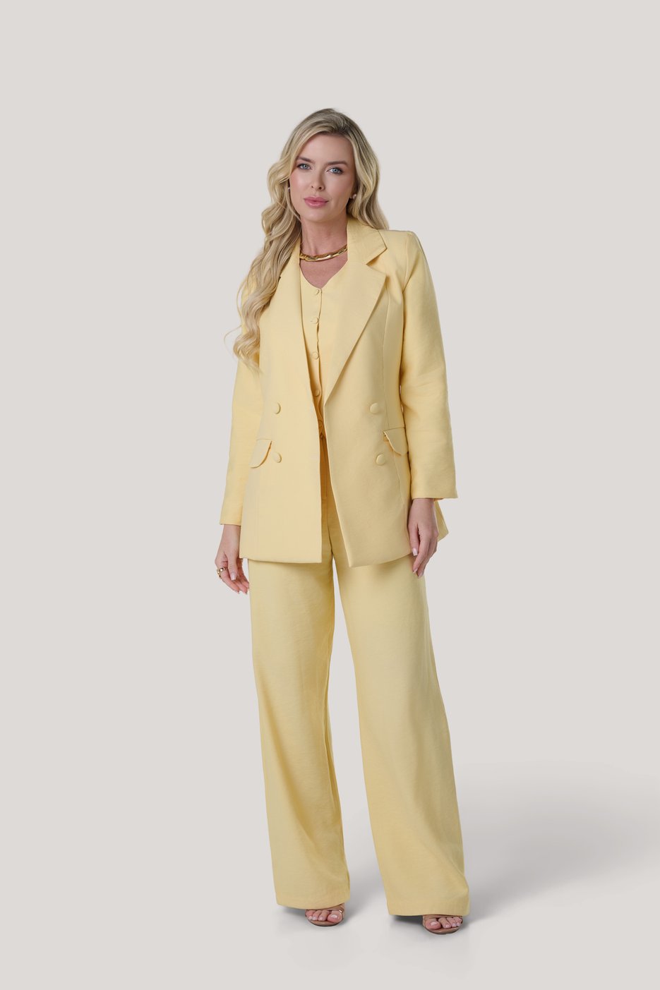 Blazer transpassado confeccionado em tecido leve e sofisticado, com modelagem clássica que une modernidade e elegância. O design de abotoamento duplo garante um visual estruturado, enquanto os bolsos funcionais com lapela adicionam praticidade e estilo.