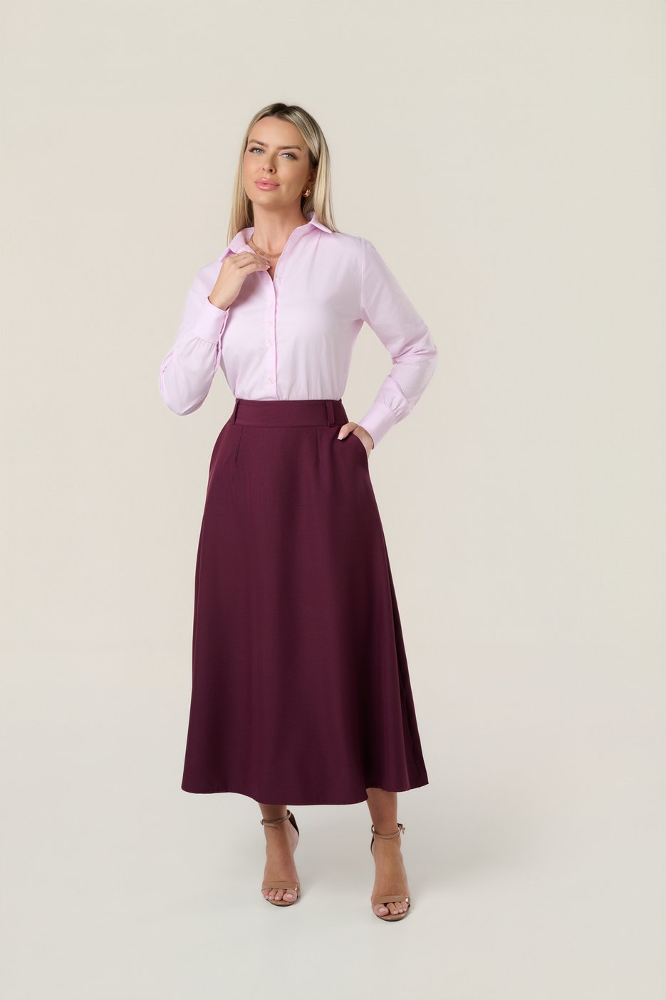 Saia Midi confeccionada em tecido plano de gramatura média, com estrutura e caimento fluido e elegante. Peça versátil que transita entre produções formais e modernas, ideal para composições com camisas, blazers ou peças mais leves.
