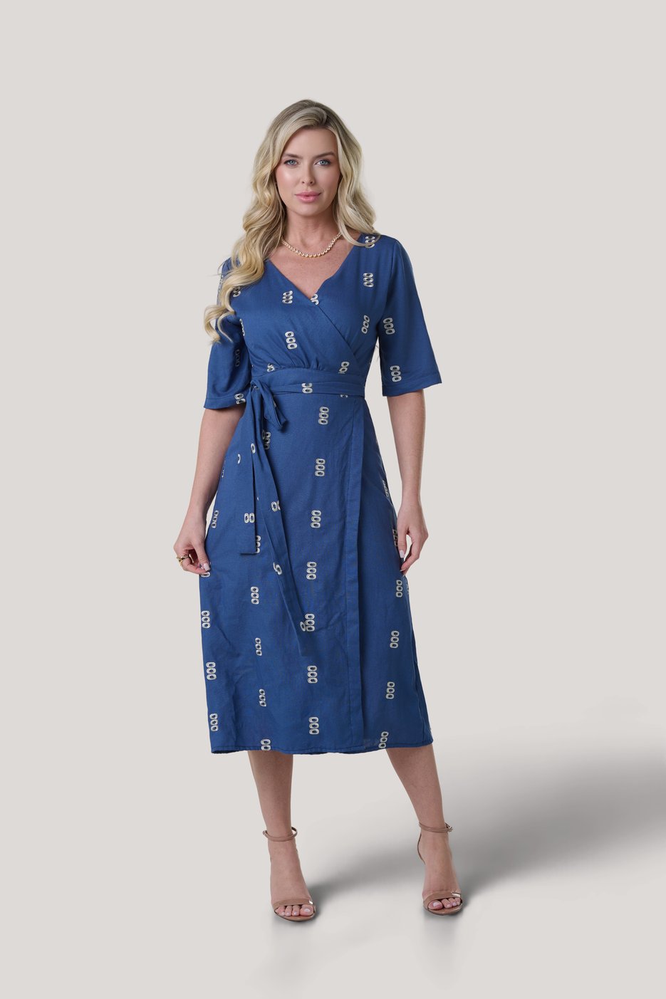 Elegante e versátil, este vestido midi em tom azul transmite sofisticação na medida certa. O modelo envelope com decote em “V” valoriza o colo de forma delicada, enquanto a amarração na cintura destaca a silhueta com feminilidade. As mangas 3/4 proporcionam conforto e equilíbrio, ideal para diferentes ocasiões.